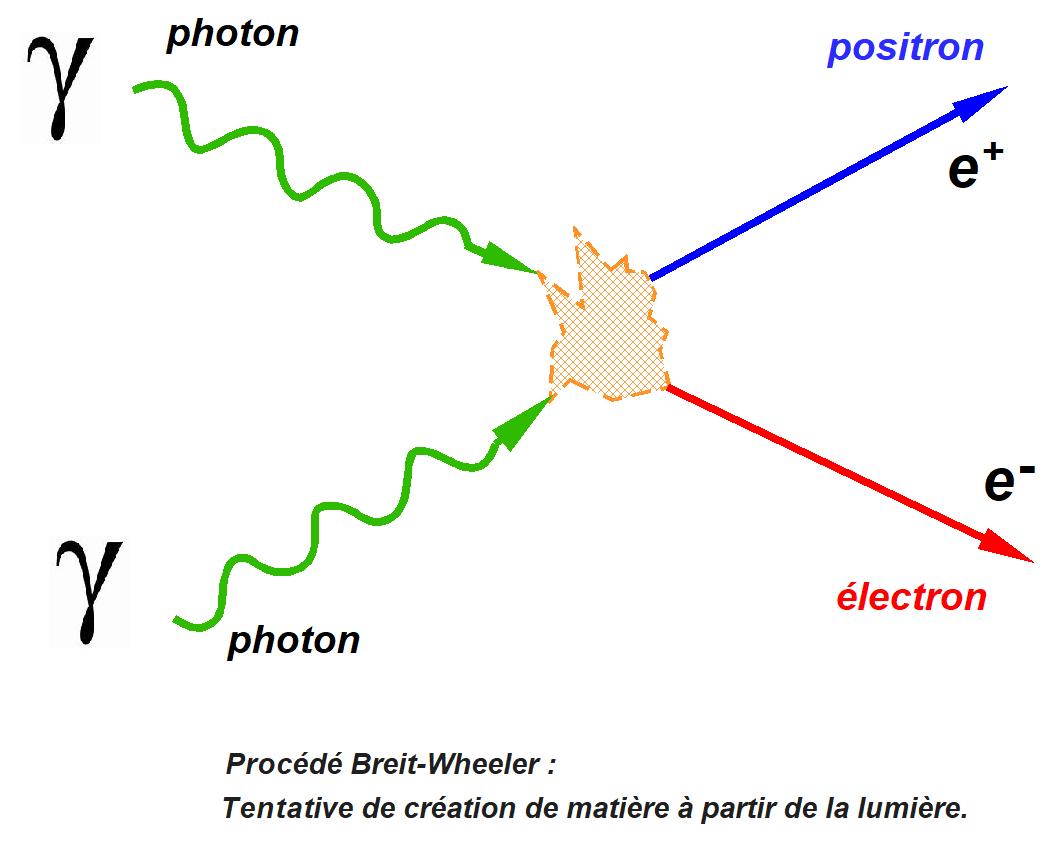 En 1934, Gregory Breit et John Wheeler ont proposé une transformation inverse à celle de Dirac, c’est-à-dire la création de matière à partir de la lumière. Deux photons de lumière pourraient s’associer brutalement pour produire deux éléments massiques : un électron et un positron. C’est une des recherches les plus audacieuses de l’électrodynamique quantique.