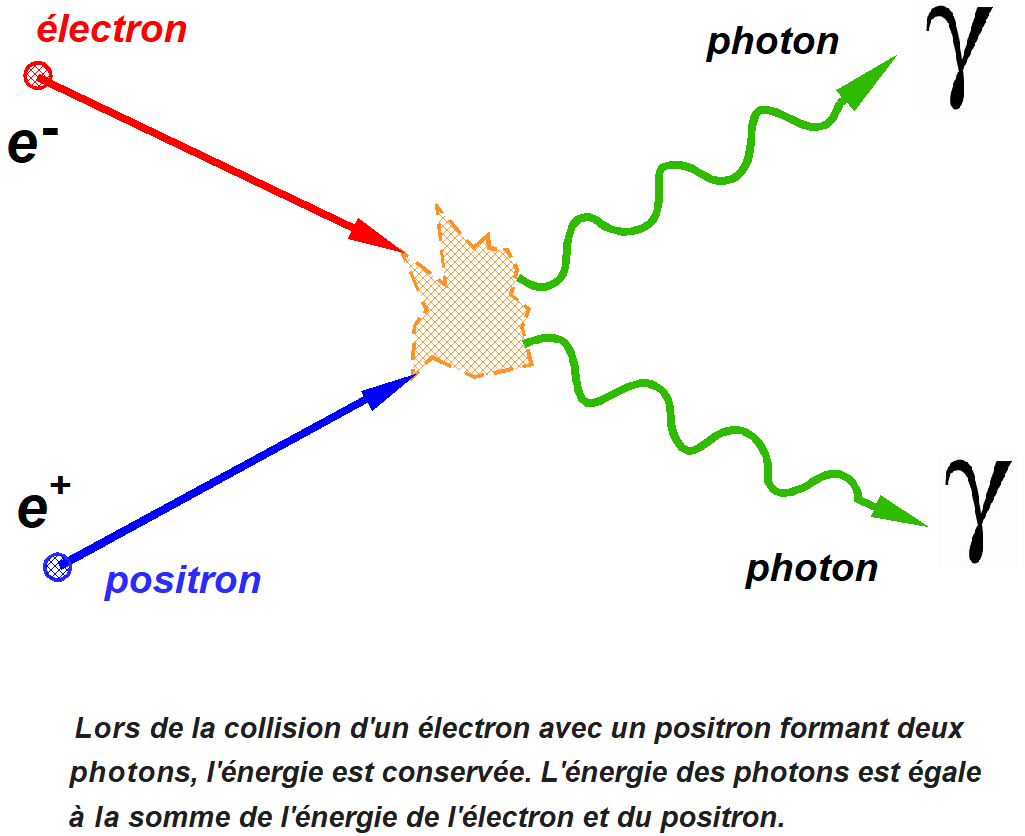 La collision d’une particule et de son antiparticule émet une quantité d’énergie donnant naissance à deux photons. L’énergie totale transportée par les photons correspond à l’énergie de masse contenue dans le système avant collision. La transformation de la matière en lumière est un fait courant avéré.
