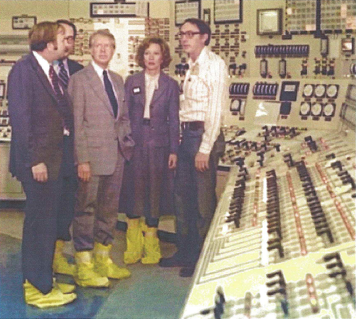 Le Président Jimmy Carter, ancien ingénieur nucléaire de l’US Navy, dans la salle de contrôle de Three Mile Island après la fusion partielle du cœur du réacteur nucléaire.