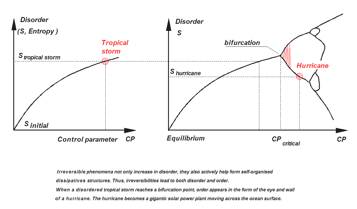 Thrown off balance during the summer months by excessive temperature differences between the ocean’s surface and the upper atmosphere, a disorderly  tropical storm can radically transform into a much more orderly hurricane following a bifurcation and varying degrees of chaos. A hurricane is a dissipative structure in which matter and energy are exchanged with the waters of the tropical seas. It is composed of order and disorder.