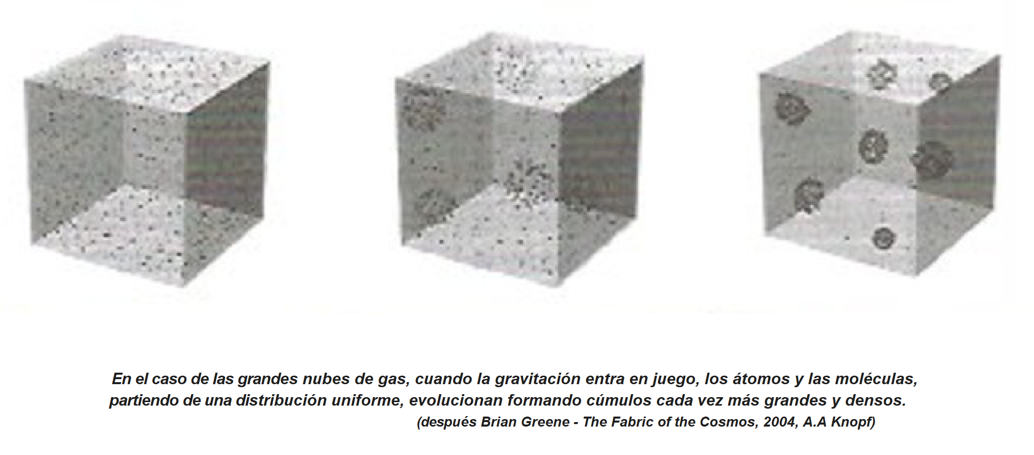 Pero estas moléculas másicas se atraen por la gravitación, de modo que pueden agruparse en cúmulos organizados causando una disminución local de la entropía compensada en gran parte por la disipación de energía produciendo un aumento global de la entropía en Universo.