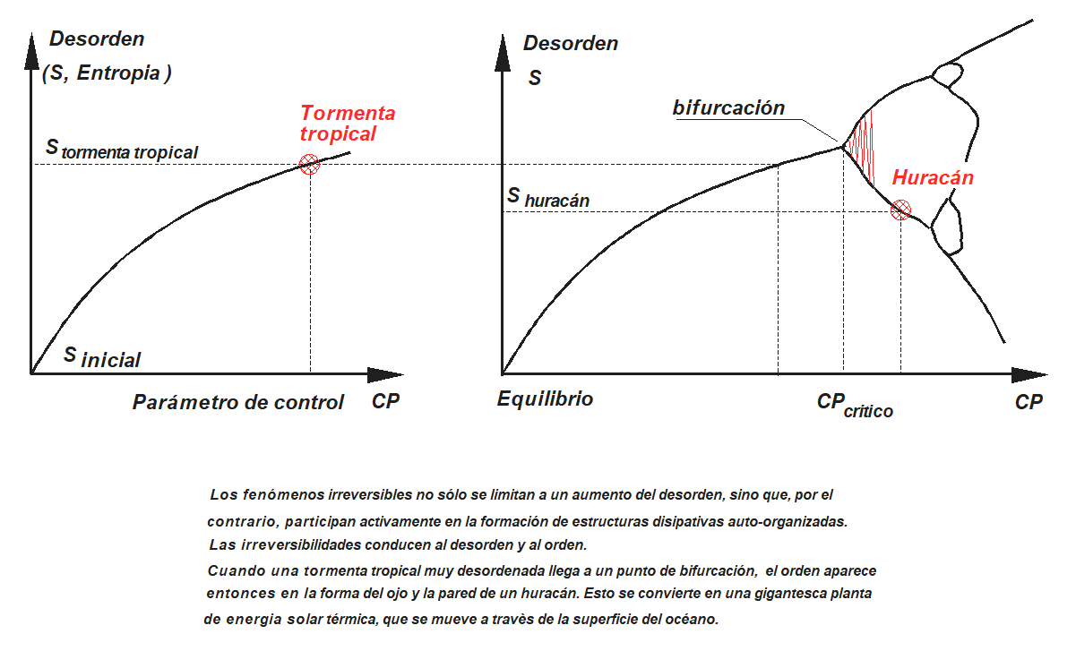 Desequilibrada durante los meses de verano por una diferencia de temperatura demasiado grande entre la superficie del océano y la atmósfera superior, una tormenta tropical desordenada puede transformarse radicalmente en una estructura de huracán mucho más ordenada después de pasar por una bifurcación y una zona más o menos caótica. Un huracán es una estructura disipativa que intercambia materia y energía con las aguas de los mares tropicales. Está compuesto de orden y desorden.